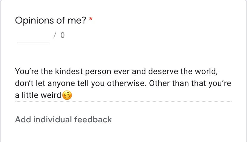 I learned that my own self-doubt is wrong; I choose to believe that people don’t secretly wish ill on you. If you are curious about your crushes and your exes, I urge you to send them the quiz I attached below. You might be surprised at the responses.